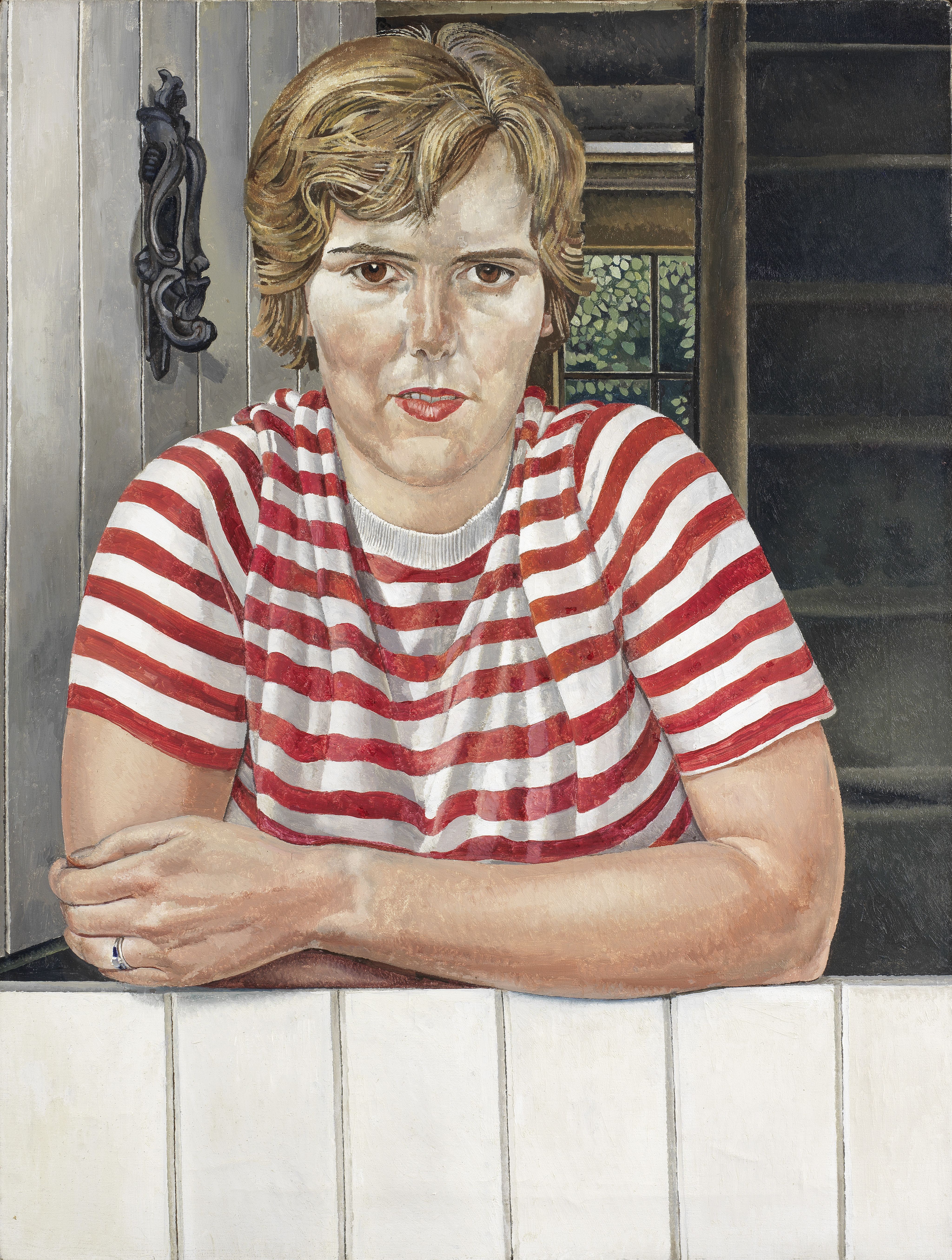 This is one of Spencer's finest late portraits, and forms a striking image, in which the twenty-three year old Linda leans over the stable-style door, at the front of her house, Sherlocks, in the heart of Cookham Dean. Dressed informally, she seems very close to the viewer, as if about to speak. Linda and Peter Few Brown moved to Cookham Dean on their marriage in 1955. In the picture, her engagement and wedding rings are clearly visible. A few years later they moved again, to Primrose Hill, another house in the Dean.
