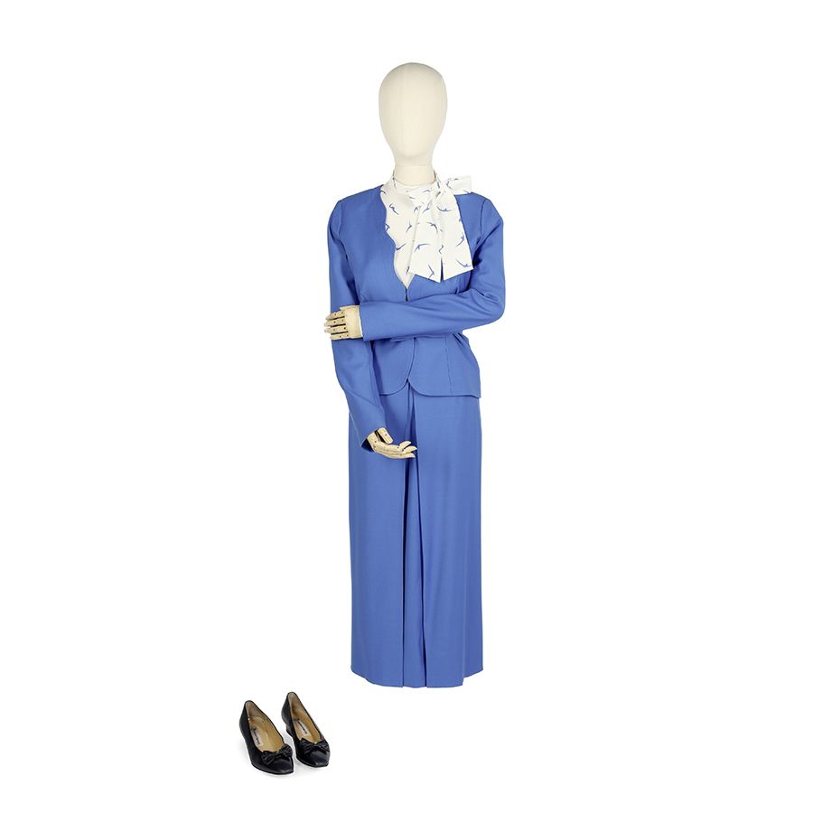 Emma Corrin (as Lady Diana): Engagement announcement blue ensemble with pussybow blouse Season 4 Episode 3. Estimate: £1,500-2,000