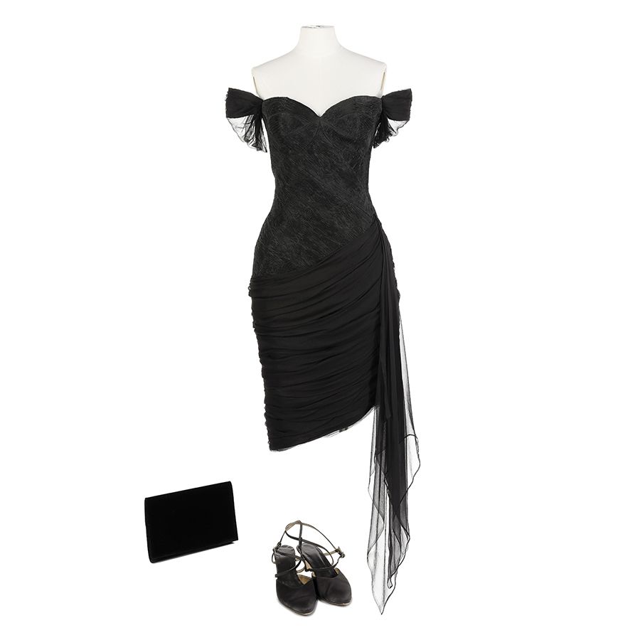 Elizabeth Debicki (as Princess Diana): The 'Revenge' dress, off-the-shoulder black cocktail dress Season 5 Episode 5. Estimate: £8,000-12,000
