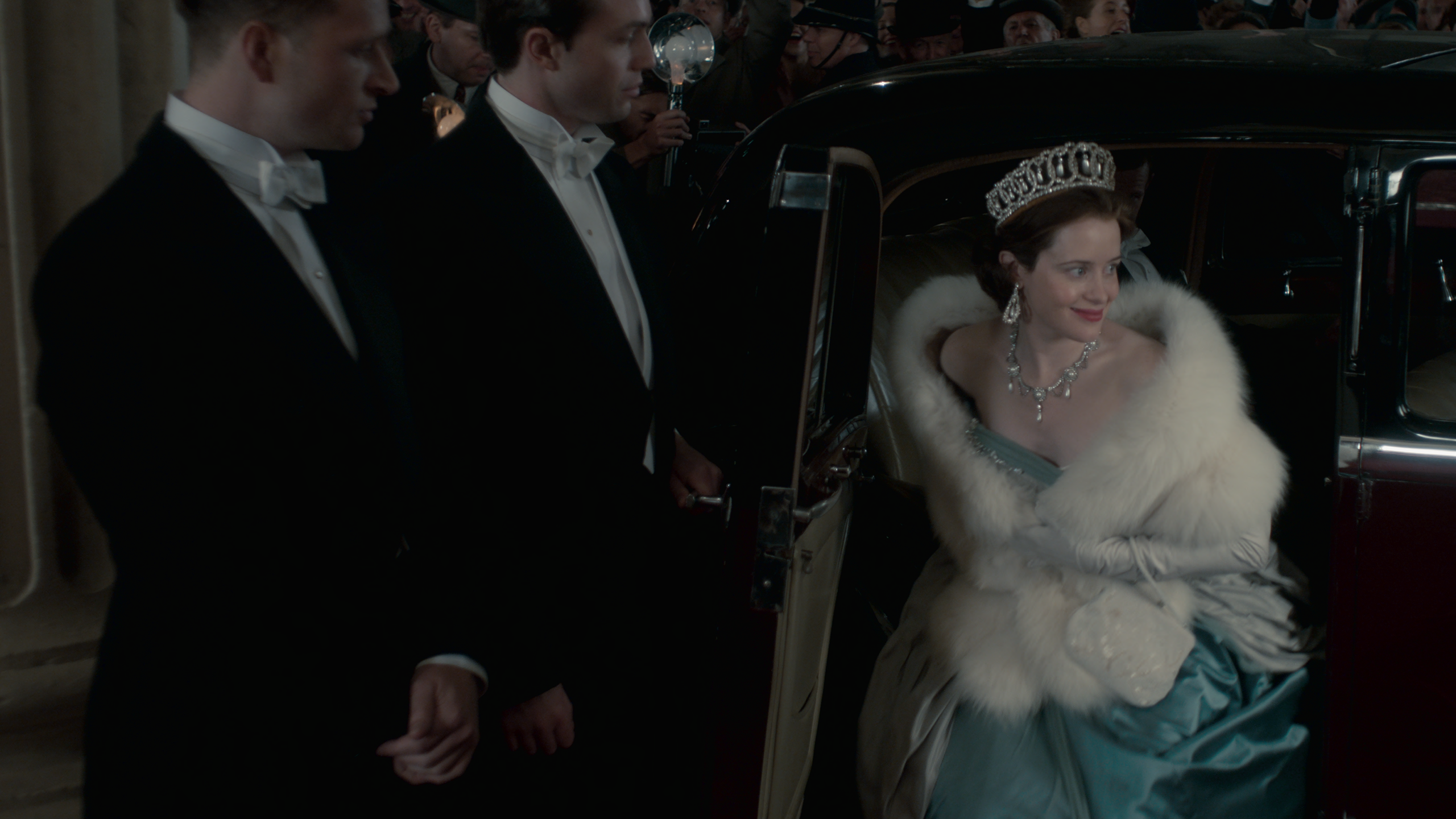 The powder blue ballgown and fur stole worn by Claire Foy (as the Queen) in the promotional poster for Season 1 Episode 5 ‘Smoke and Mirrors’.