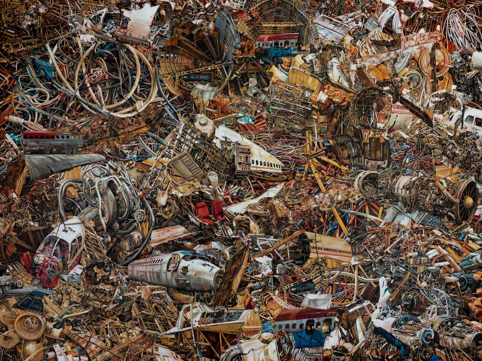 The beautifully haunting Waterscape II (2020) was painted by contemporary Thai artist, Chaichana Luetrakun. Imposing in both size and subject matter, Waterscape II is a clear comment on the threat of pollution and the crisis of waste that plagues modern society. Rather than a waterscape, as the painting’s title suggest, we are confronted with a tangled pile of debris- including various types of aircraft, from Boeings to military jets.
