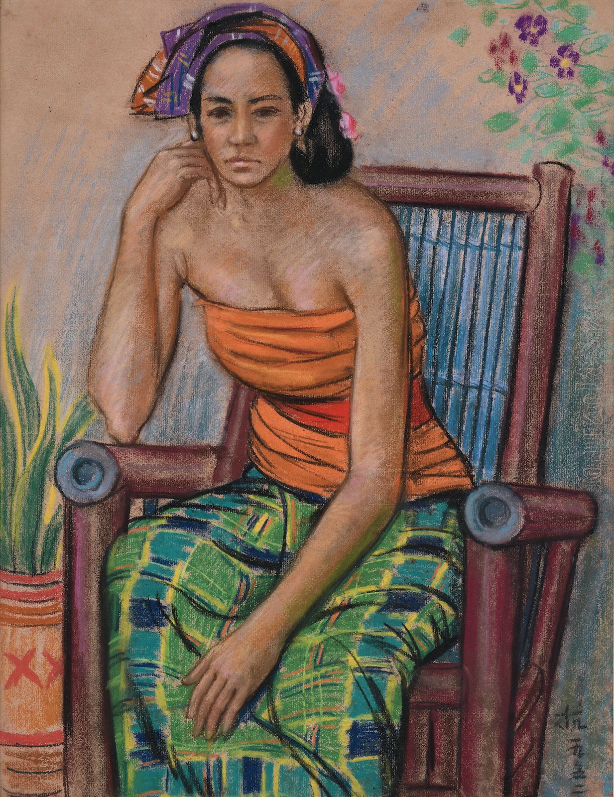 This pastel portrait was painted by prominent Nanyang School artist, Liu Kang. In 1952, Liu Kang along with the rest of the Nanyang School travelled on an artistic quest to Bali which became a great source of inspiration for them. While Singapore was undergoing rapid urbanisation, Bali was perceived as “paradise on Earth”, unspoilt and untainted by industrialisation. Whilst exploring the island, they encountered artist, Adrian-Jean Le Mayeur, who welcomed them into his home and introduced them to his wife and muse, Ni Pollok.