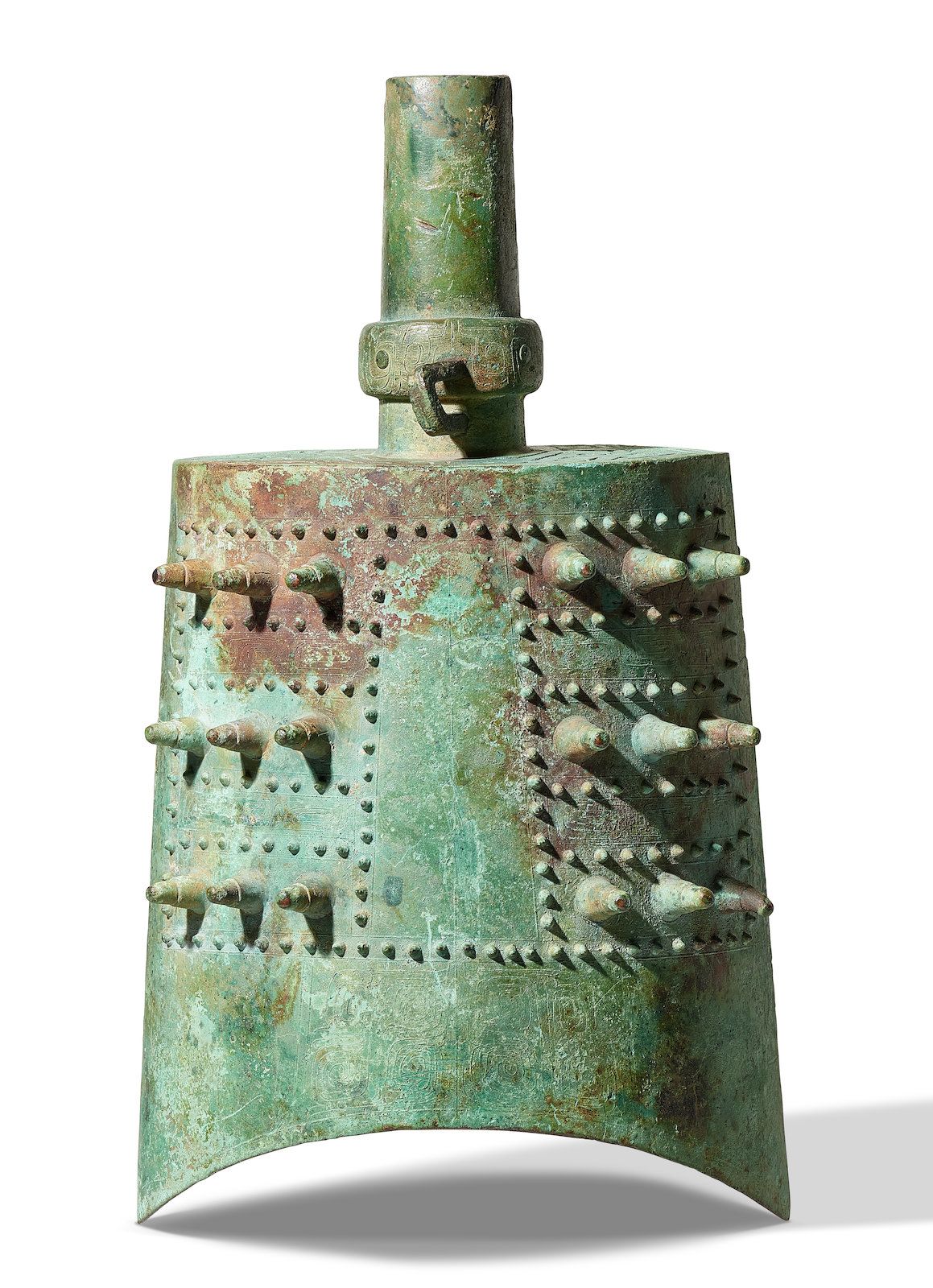 Only a few sets of early Western Zhou yongzhong bells were found in archaeological settings. This bell on offer appears to be one of the earliest known examples of two-tone bells, with motifs decorated to indicate the striking point for a second tone.
