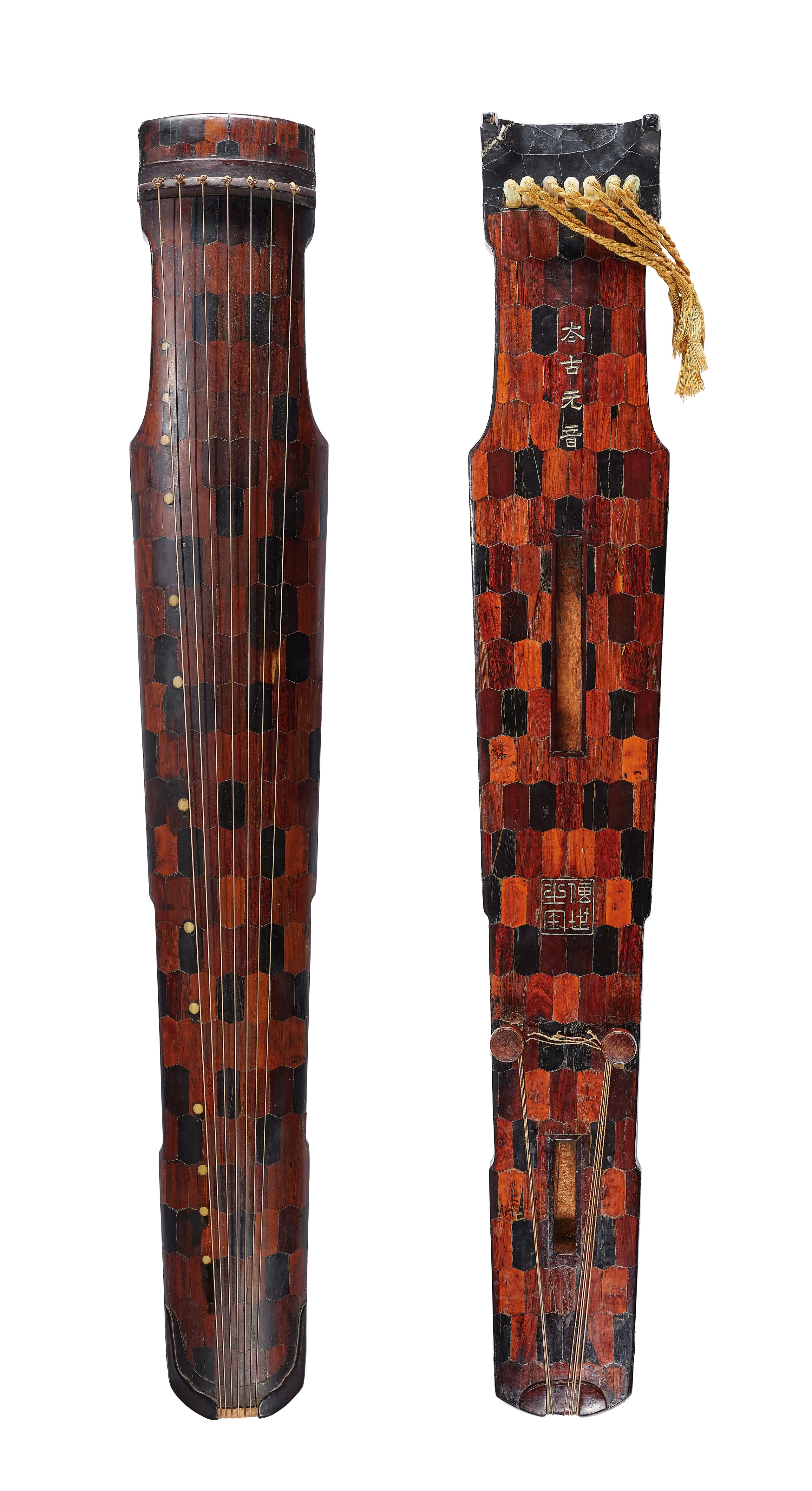 This Zhong Ni style (also known as Confucius-style) guqin, decorated with various woods cut hexagonally, was crafted in an extremely rare technique known as bai na (which translates as hundred patches), referring to the patchwork vestment worn by Buddhist monks. At present, there are only two known bai na constructed qins in China's public museums that are similar in age and craftsmanship to the present lot. They are in Beijing Palace Museum and Sichuan Provincial Museum respectively.