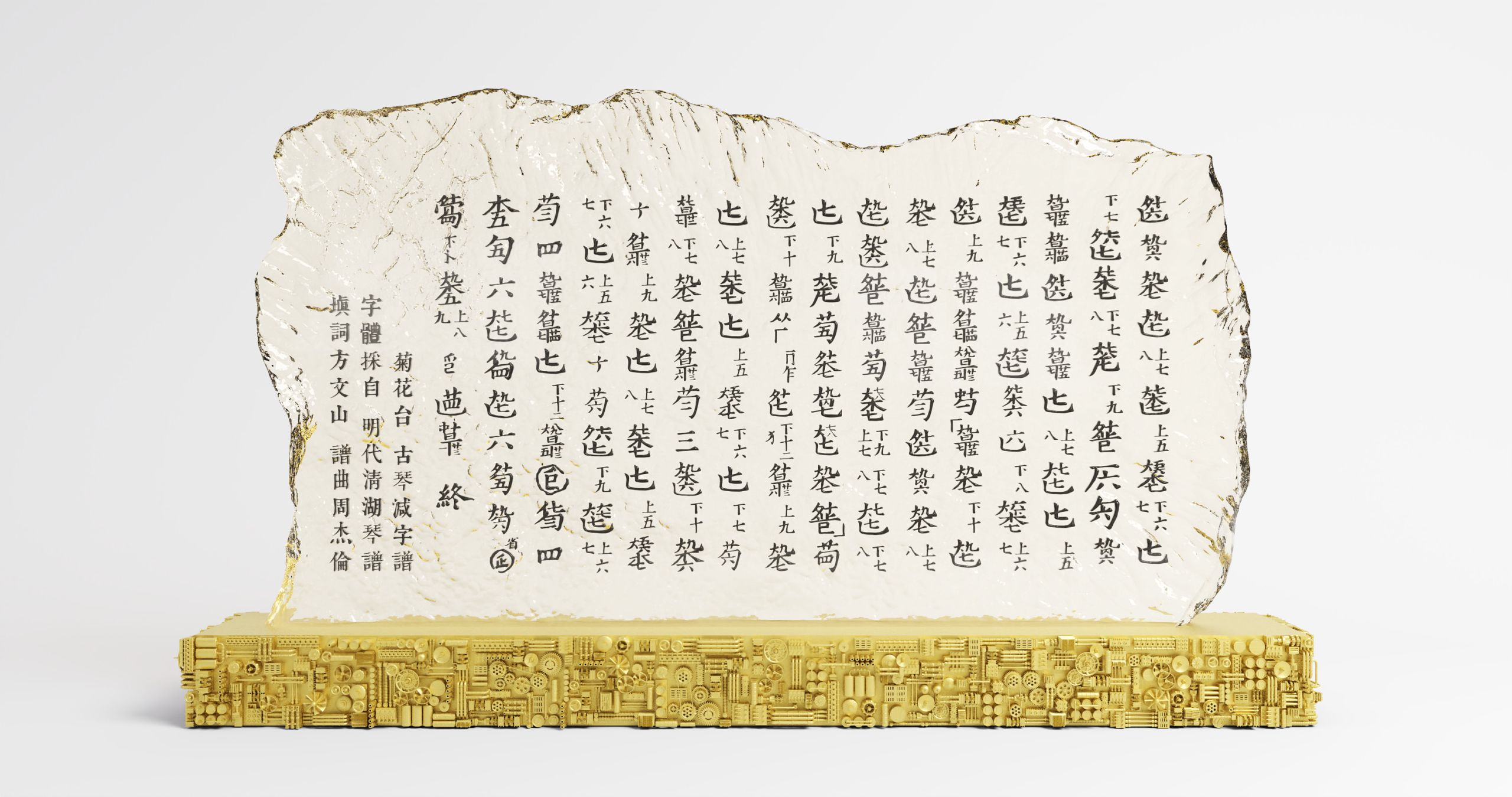 Designed by Vincent Fang (b.1969), a Taiwanese multi Golden Melody Award winner lyricist, this contemporary installation is inspired by jianzi pu, a unique form of tablature for guqin.