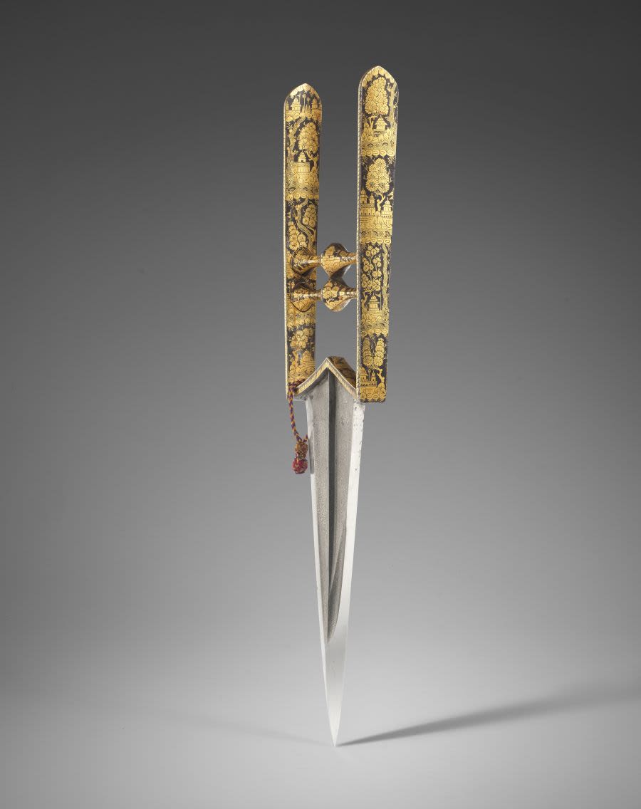 This particular katar is remarkable due to its exceptionally fine gold-inlaid decoration. Depicting pavilions in a landscape connected by meandering streams, the decoration exemplifies the Mughal preoccupation with nature and conjures images of palaces and cool leisure gardens, the beautiful and serene scenes providing a sharp juxtaposition to the function of the weapon itself.