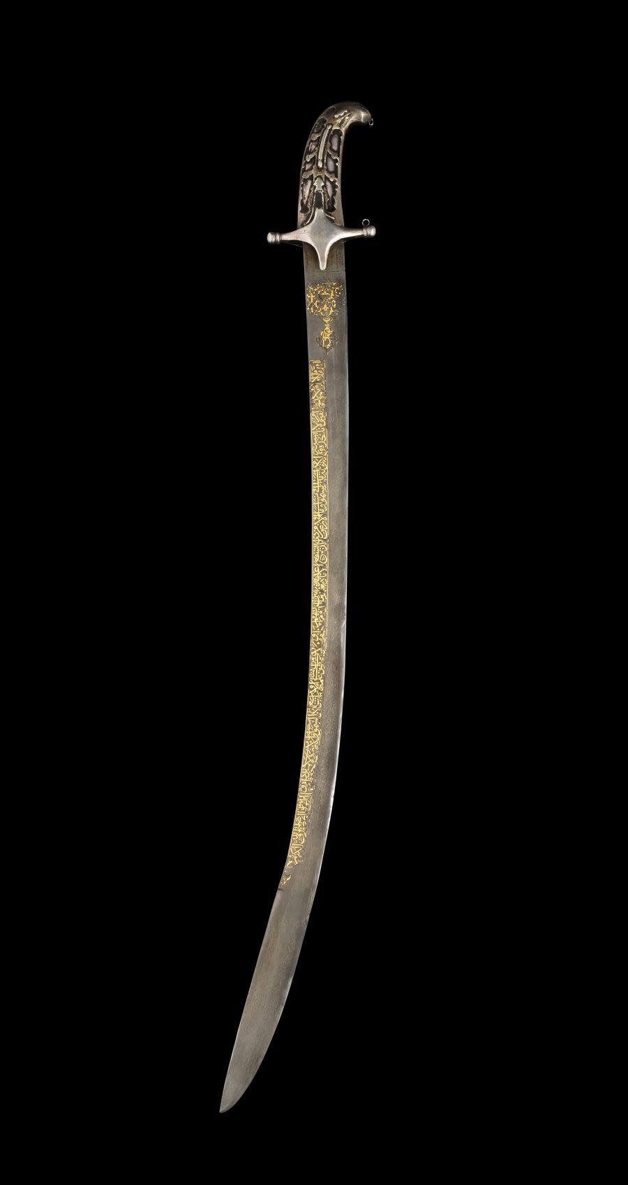 The inscription running along the spine follows a long-standing tradition dating back to the early Mamluk period of incorporating long panels of text, the calligraphy on our sword having been executed in elegant thuluth script. The sword combines this text with inscription-filled cartouches and sweeping arabesques, all within a finely watered steel blade, resulting in an extraordinary piece of Ottoman weaponry.