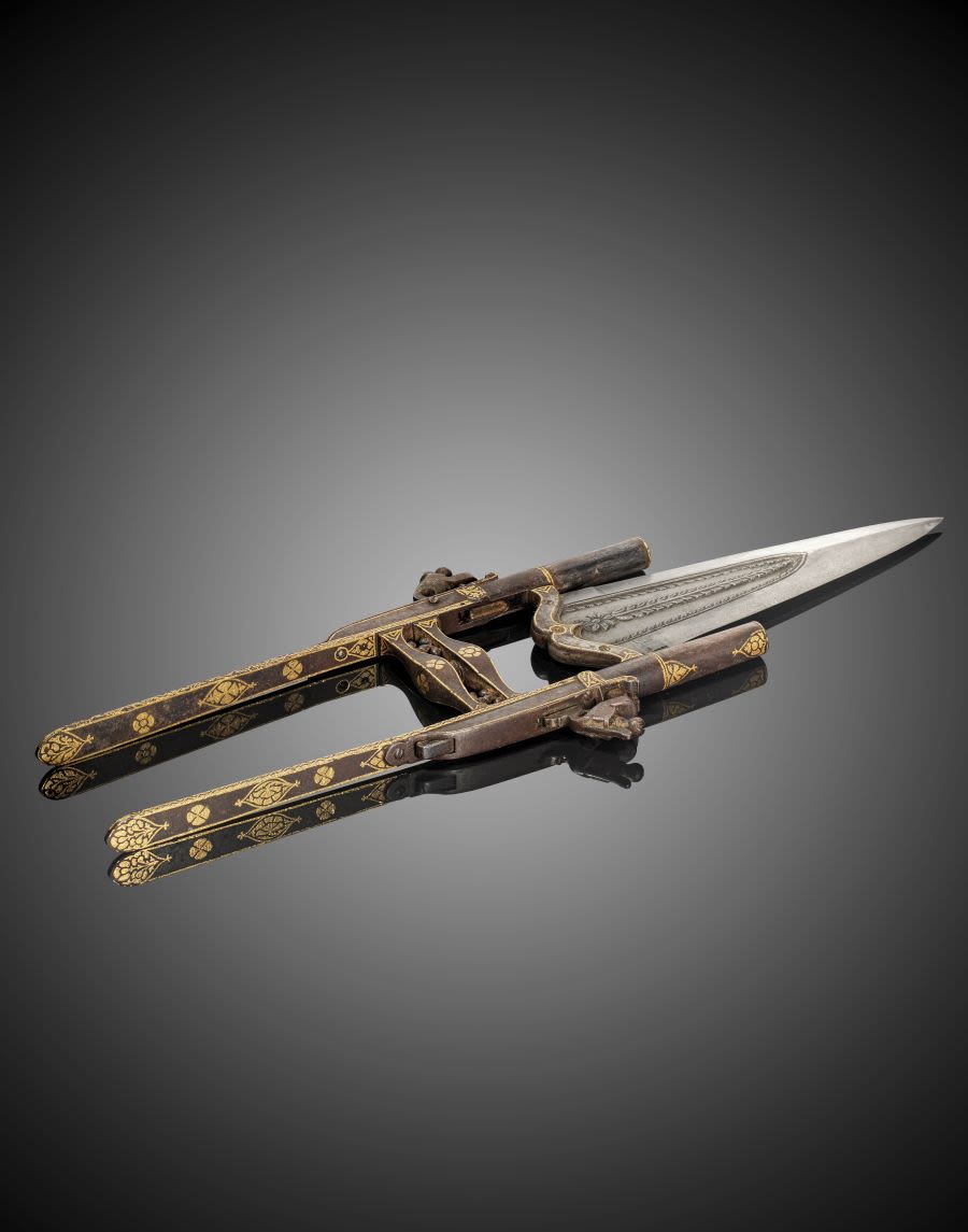 A rare gold koftgari steel combination percussion pistol push dagger (katar) India, 19th century. Estimate: £15,000 - £20,000.
