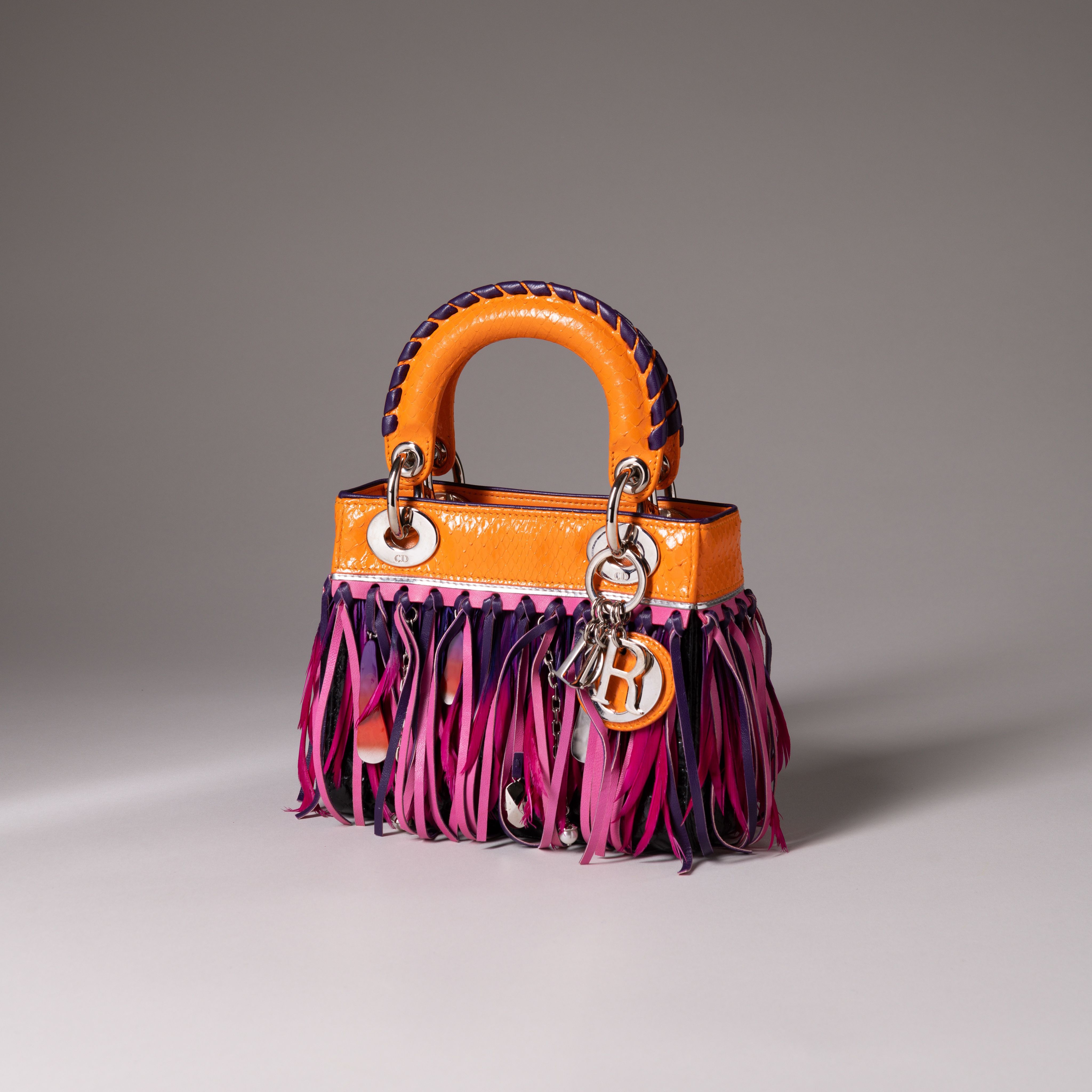 Le sac à main « Lady Dior » est une pièce maîtresse de notre vente aux enchères. Luisa Alfieri-Federici aimait tellement ce modèle qu'elle possédait plus de 30 pièces, dont 20 sacs « Mini Lady Dior » créés par John Galliano en 2011, comme cet incroyable exemple à franges en cuir rose et violet, orné de perles émaillées et de plumes.