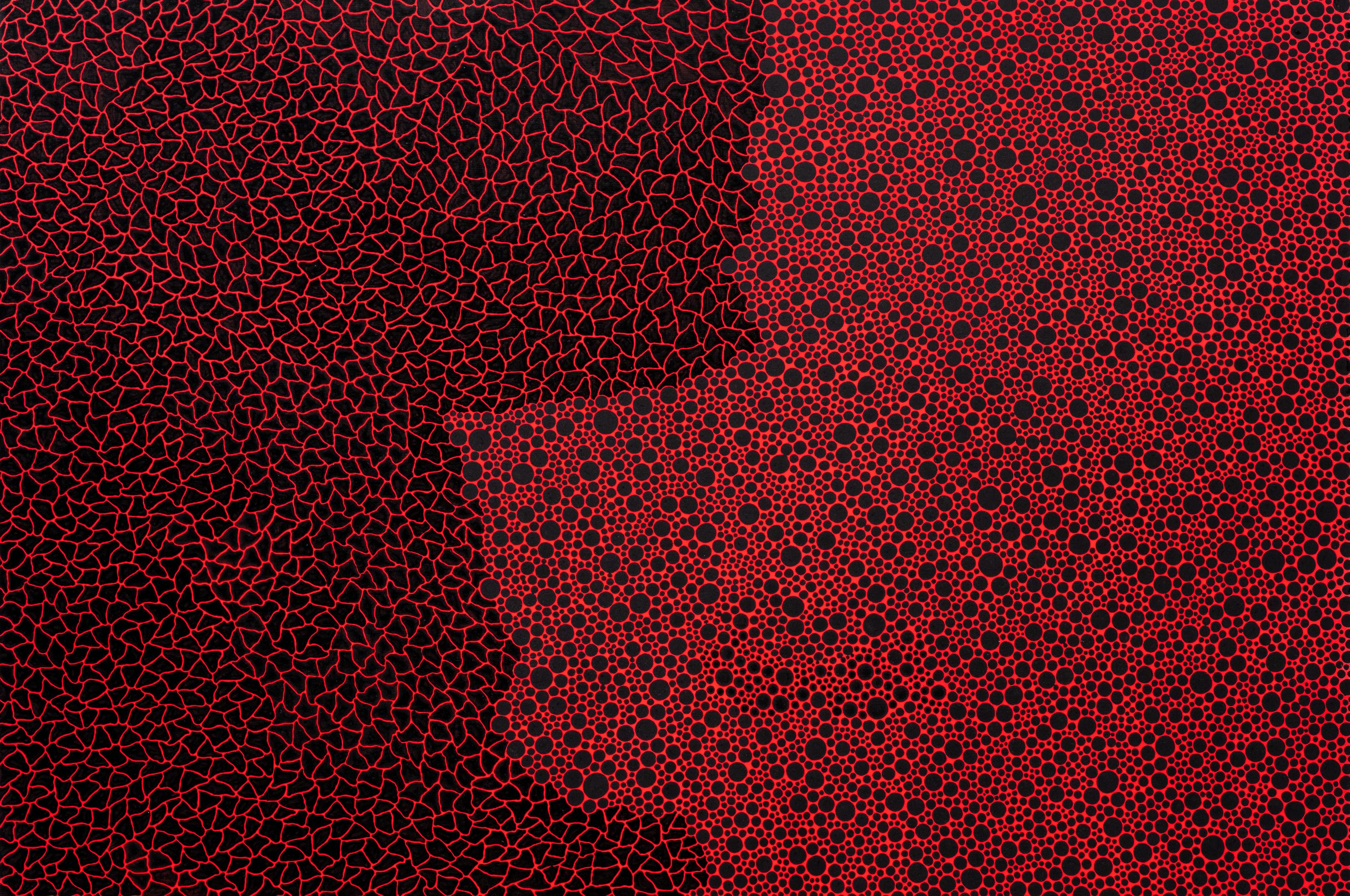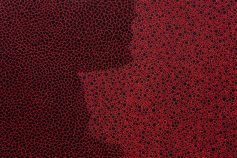 The binary composition of Infinity can be interpreted as a conflict, but it can also be read as an intimate relationship between two constituents. The way in which the two halves of dots and nets interlock with each other is reminiscent of a deep emotional bond between two people.