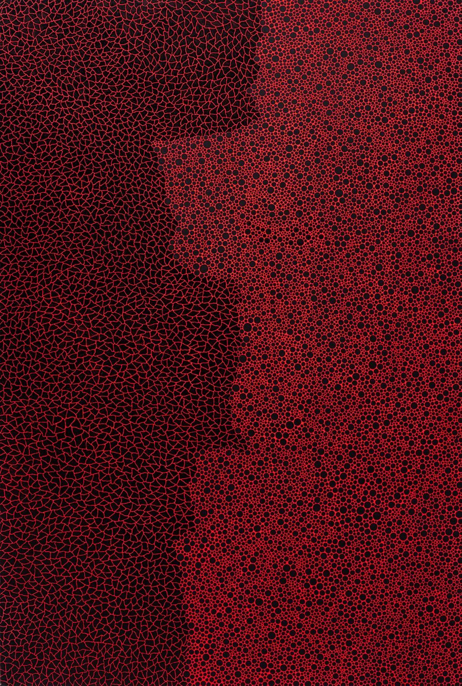 Viewing from a distance, this large-scale vertical work is clearly divided into two halves—the left and right pieces in different shades of dark red distinctly meet at the barrier. Upon closer inspection, viewers can identify the polka dots on the right half and the infinity nets on the left. The line at which the two halves meet is full of twists and turns. This fills the otherwise serene picture with a strong sense of rhythm and a unique temperament.